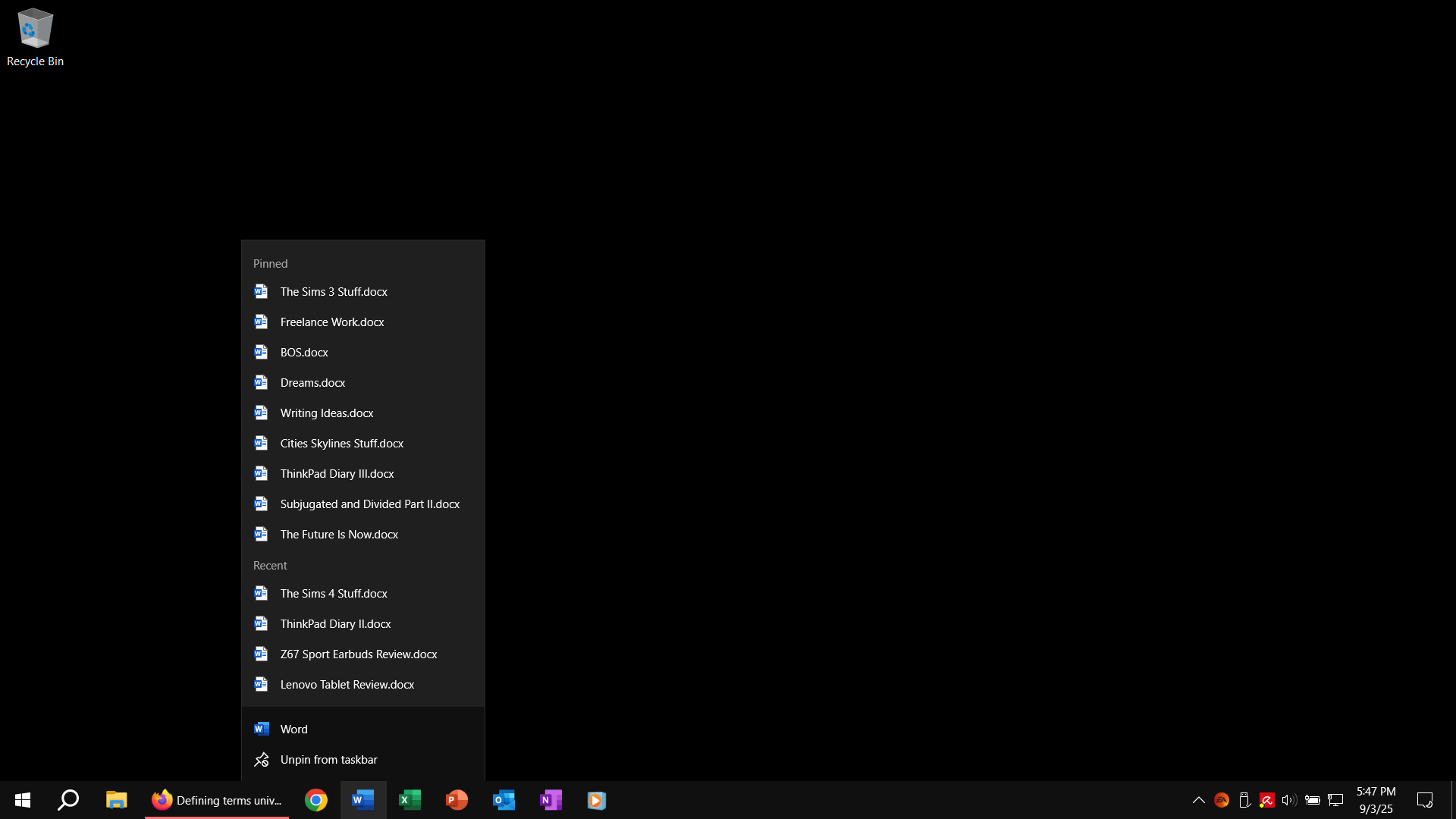 The jump list is the list that shows up when you right click on an icon in the taskbar, as well as the taskbar itself. The example is when I right click on Microsoft Word 2019 pinned to my taskbar. It usually shows Pinned & Recently opened files. For the internet it sometimes shows the same, though there's no way to really control the Jump List. And OneNote doesn't really have one, at least not with specific notes you can "jump" to.