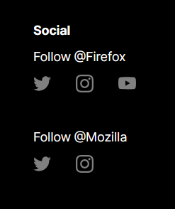 https://connect.mozilla.org has Twitter, Instagram, and YouTube, but only for Mozilla: