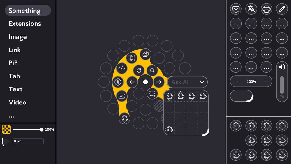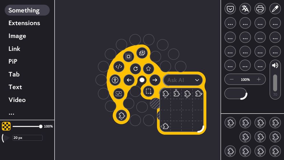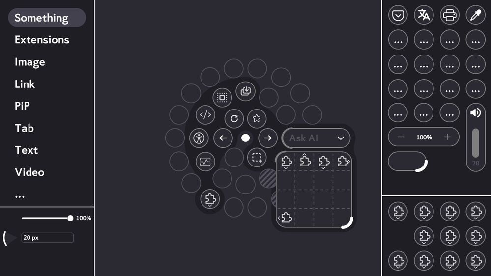 I found that the options in the right-click menu would be different when I right-clicked on different things (it's not that hard to find out), so I think we should be able to customize the right-click menus for different things (i.e., the squares on the left-hand side block of the page). The white "●" in the center of the menu indicates the position of the cursor when the right-click button is pressed. The "●" can be dragged anywhere in the middle of the page to simulate the behavior of the menu when the right button is pressed in different places (I don't want to draw it, please imagine it yourself). In the future, if other Firefox functions are made into right-click menu options, they may be made into different shapes, so I've drawn two options on the right side of the page to show that the new right-click menu can be arranged in a strange way. As for the rounded square tray, it can be adjusted to a minimum size of 1×2, 2×1 (drag-and-drop ◞ adjustment), and a maximum of 32×32 should be enough, right? Also, the trays can be plural, so you can play with them like this: