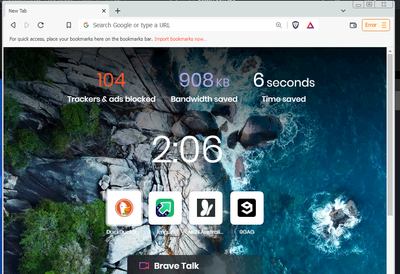 Brave's new tab page below incl number of trackers/ads blocked, bandwidth and time saved: