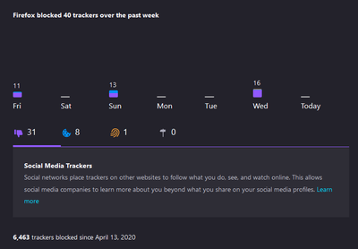 - Include stats about blocked ads/trackers etc - Since FF is privacy focused, why not display info from about:protections front and center instead of hiding it!