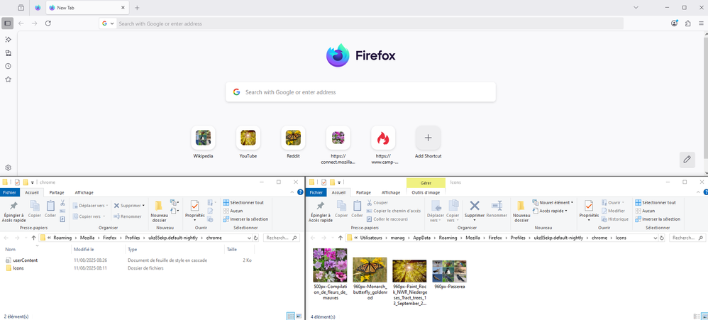 @-moz-document url(about:newtab), url(about:home) { .top-site-outer { &:nth-child(1) { .top-site-icon { background-image: url("///C:/Users/manag/AppData/Roaming/Mozilla/Firefox/Profiles/ukz85ekp.default-nightly/chrome/Icons/960px-Passerea.png") !important; } } &:nth-child(2) { .top-site-icon { background-image: url("///C:/Users/manag/AppData/Roaming/Mozilla/Firefox/Profiles/ukz85ekp.default-nightly/chrome/Icons/960px-Paint_Rock_NWR_Niedergeses_Tract_trees_13_September_2023.png") !important; } } &:nth-child(3) { .top-site-icon { background-image: url("///C:/Users/manag/AppData/Roaming/Mozilla/Firefox/Profiles/ukz85ekp.default-nightly/chrome/Icons/960px-Monarch_butterfly_goldenrod.png") !important; } } &:nth-child(4) { .top-site-icon { background-image: url("///C:/Users/manag/AppData/Roaming/Mozilla/Firefox/Profiles/ukz85ekp.default-nightly/chrome/Icons/500px-Compilation_de_fleurs_de_mauves.png") !important; } } } }